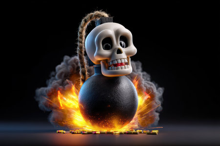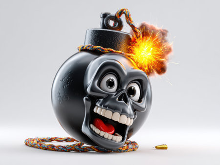 3D cartoon, a happy skull on a black bomb icon with a burning lit fuse