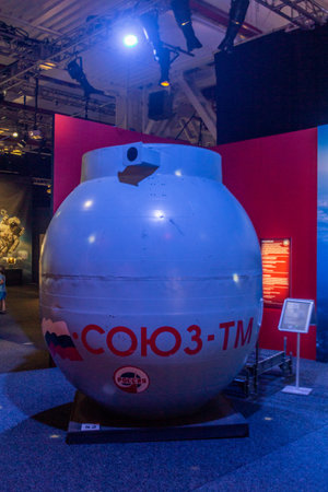 PRAGUE, CZECHIA - JULY 10, 2020: Cabin of Soyuz 3-TM at Cosmos Discovery Space Exhibition in Prague, Czech Republic