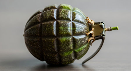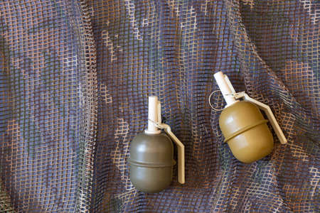 Two hand grenades lie on a camouflage net as a background, military background, military grenade