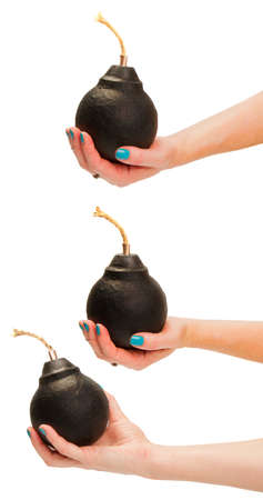 hands of an adult woman holding a classic round bomb with a wick in several positions on a white background