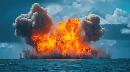 A spectacular scene of a massive explosion over the ocean, showcasing vibrant orange flames and dark smoke against a dramatic cloudy sky. Perfect for themes of power and nature.