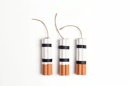 Dynamite made from cigarettes on white background. Stop smoking concept. Flat lay, top view with copy space.