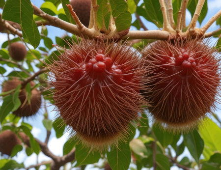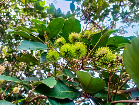 Green rambutan fruits on a tree branch in Zanzibar, Tanzania.