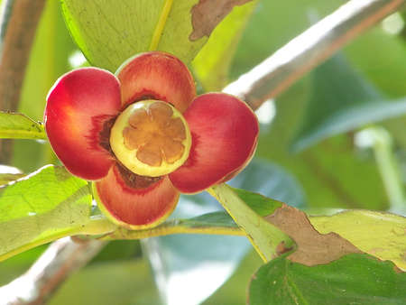 A young mangosteen fruit, Manggis, (Garcinia mangostana L.), on its tree.