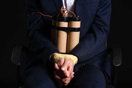 Male hostage with bomb on dark background