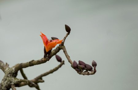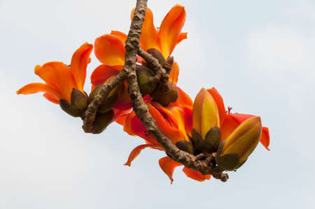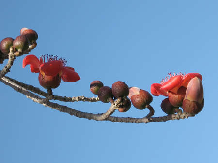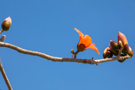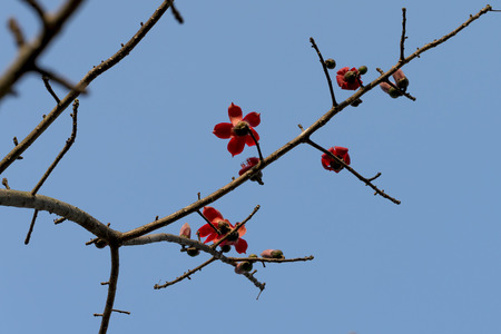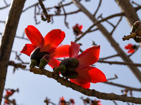 Branch of blossoming Bombax ceiba tree or Red Silk Cotton Flower