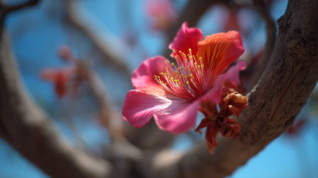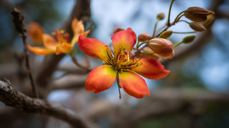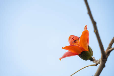 Vibrant orange flower blossoming on tree branches against soft blue background