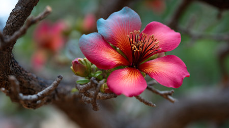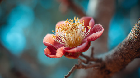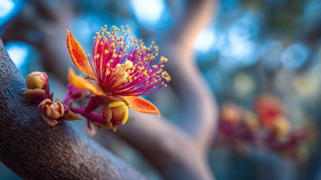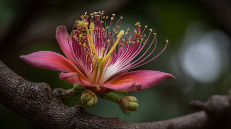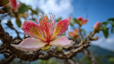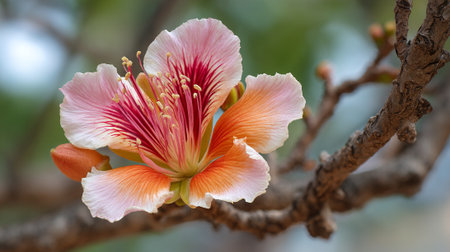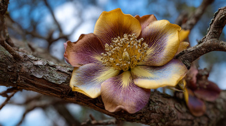 Exotic flower blossom on a textured tree branch in nature