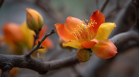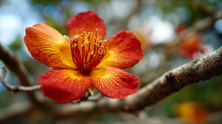 Striking red and yellow flower in full bloom on tree branch.