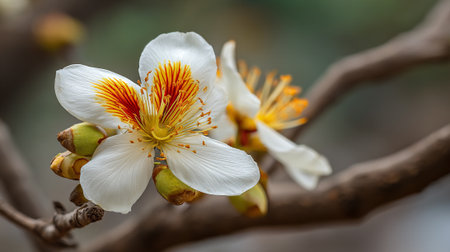 Beautiful White and Red Flower Blooming on a Branch in Springtime