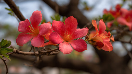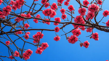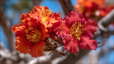 Elegant red flowers on a tree branch with blue sky backdrop.