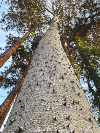 A vertical low angle shot of the thorns on the trunk of a silk floss tree in Valencia, Spain