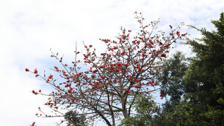 Blossoming Bombax ceiba tree or Red Silk Cotton Flower