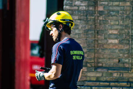 Seville Spain September 22, 2021 Seville firefighters training at the fire station during the coronavirus outbreak, they are training in the use of firefighting equipment under intervention conditions