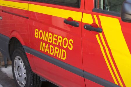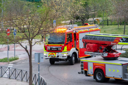 San Sebastian de los Reyes, Madrid, Spain; 29/03/2020: Firefighters take to the streets with lights and sirens to encourage citizens to maintain confinement due to the state of alert, coronavirus