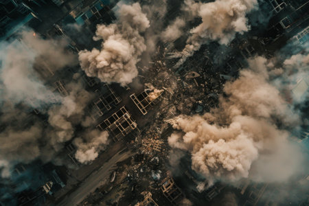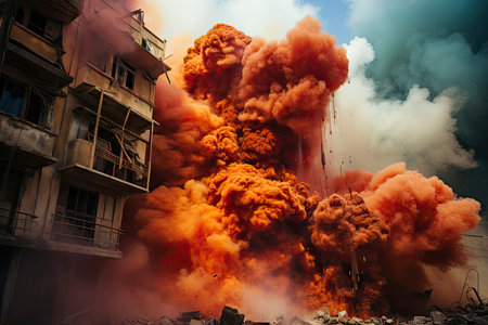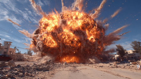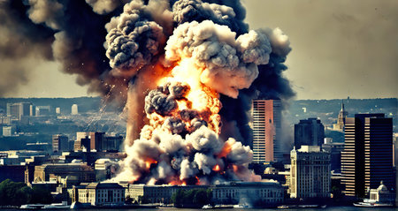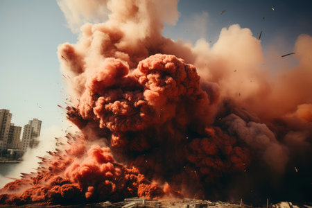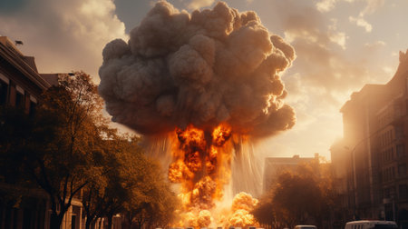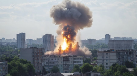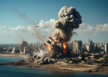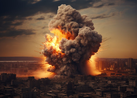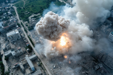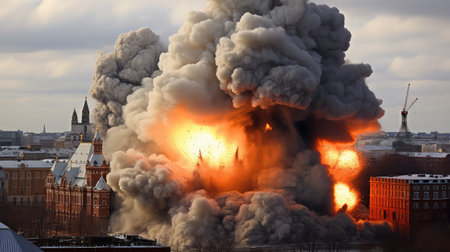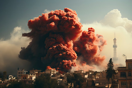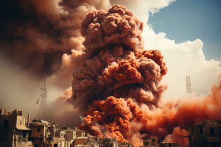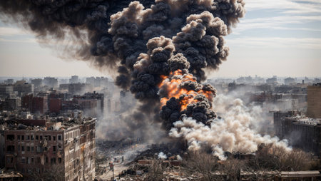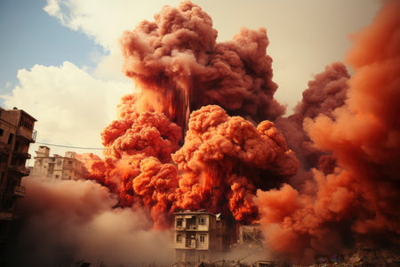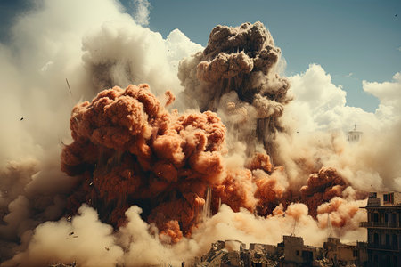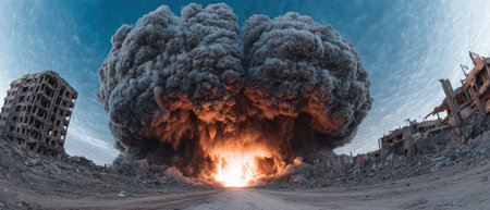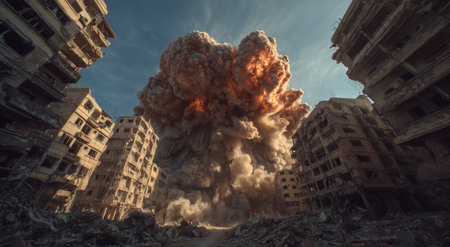 A large explosion erupts in a devastated city landscape, clouds of smoke and debris fill the sky, highlighting the intense destruction and aftermath of conflict.