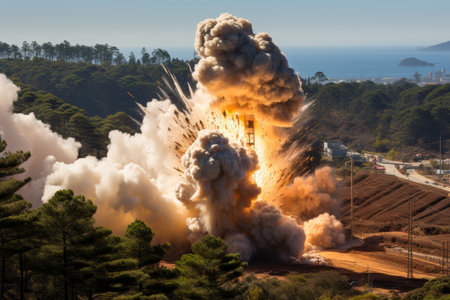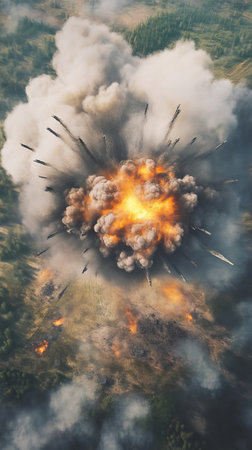 Aerial view of a massive explosion in a forested landscape, smoke and fire spreading. Destruction and chaos concept