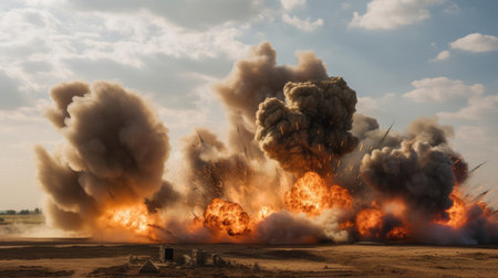 A powerful explosion sends debris and smoke into the air, creating chaos in a barren desert at midday.