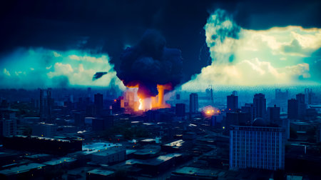 A spectacular nuclear explosion erupts in the night sky above a city, its fiery plumes creating a stark contrast against the urban skyline