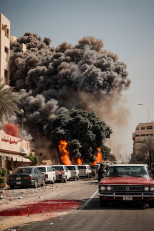 city under attack, explosion, fire, people running, traffic jam, apocalyptic illustration generative ai art