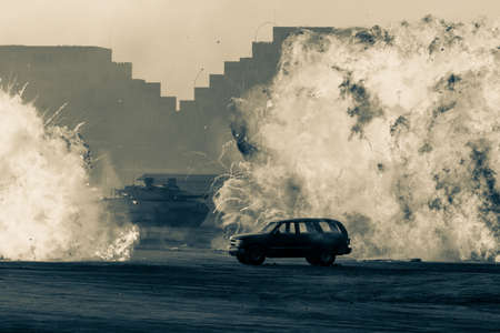 Close up of a Military strike or strike or bomb in war on an SUV with tanks causing fire balls and explosion in the town in chaos. Military war concept. Strength, power, force, fire, explosion.