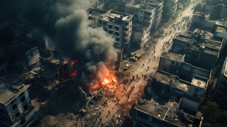 Apocalyptic view of war-torn city center Burning city War zone with smoke and fire.