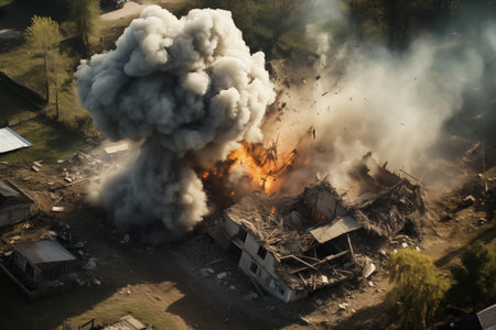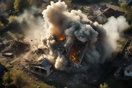 Top view of explosions, destroyed houses.