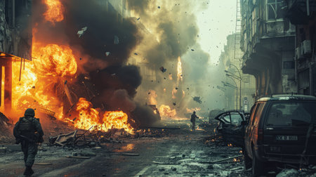 War and explosions in city streets. Military men, soldiers during an armed conflict in destroyed city. World war, fire and destruction.