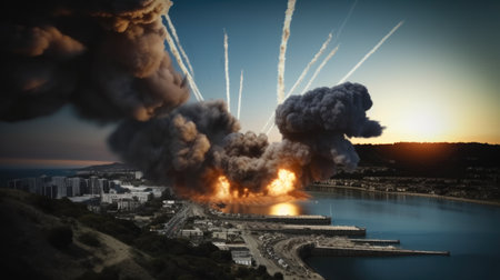 Aerial warfare devastation with explosions and fire as drone strikes destroy cities