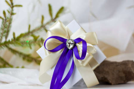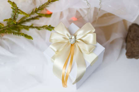 A Christmas gift decorated with a beautiful bow on a light background with a twig, if. Selective focus. the concept of Christmas and New Year. background for the banner.