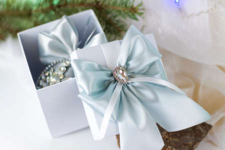 A Christmas gift decorated with a beautiful bow on a light background with a fir twig. Gifts, joy, surprise. Selective focus. the concept of Christmas and New Year. background for the banner.
