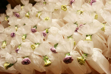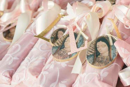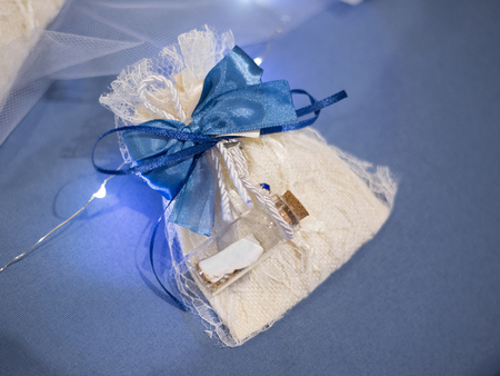Gifts or favors for the first or holy communion. Small bags of white fabric with ear of wheat and Tau Christian cross. Religious symbol