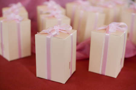 Handcrafted gift boxes display a variety of pastel ribbons, perfect for weddings, parties, or any celebratory events, adding charm and elegance.