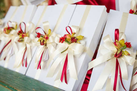 blur background of Gift box and ribbon bow for celebration festival event new year party