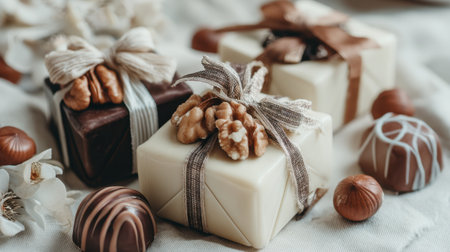 A beautiful arrangement of assorted gourmet chocolates and gift boxes, elegantly tied with ribbons and adorned with nuts, set on soft fabric. Perfect for festive occasions.