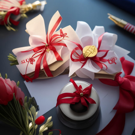 A beautifully arranged gift box featuring a satin ribbon and a jewel centerpiece. This image captures elegance, perfect for showcasing special moments and celebrations.