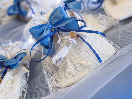 Wedding favor decorated with lace and blue ribbon with message in a bottle with white labels ready to personalize with your text