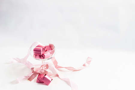 Boxes for small gifts in pastel colors and rosebuds on a light background with place for text. Advertising, poster.