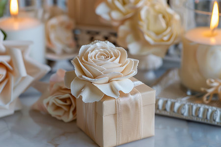 Elegant Gift Box with Intricate Rose Design Amidst Candlelit Table Setting for Sophisticated Events and Celebrations AI Generative