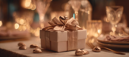A beautifully wrapped gift box adorned with a bow and small heart ornaments, set in a luxurious, glowing ambiance. Perfect for celebrations, weddings, or romantic occasions.
