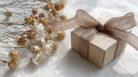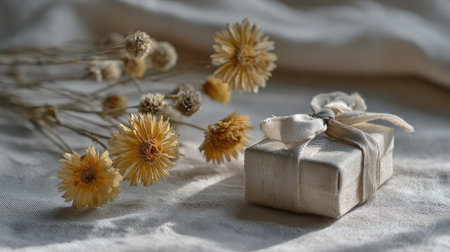 A delicate gift box wrapped in soft fabric sits gracefully beside dried flowers on a light backdrop, evoking feelings of warmth and elegance for memorable occasions.