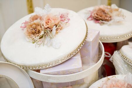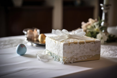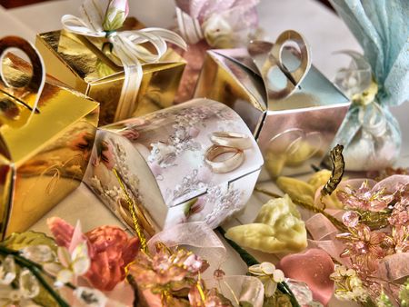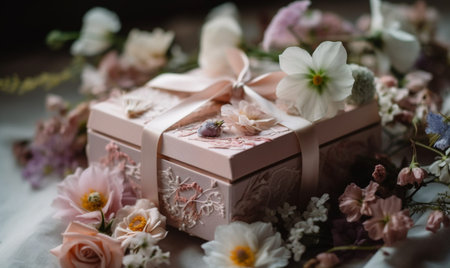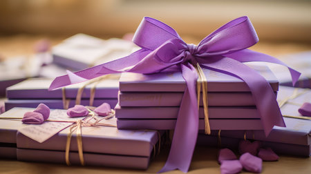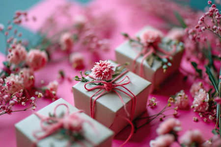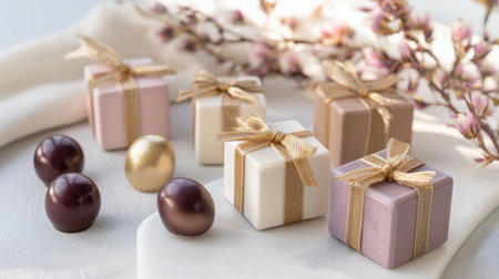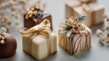 A charming display of gift boxes wrapped in ribbon alongside chocolates and delicate flowers, perfect for adding elegance to any festive occasion or celebration.