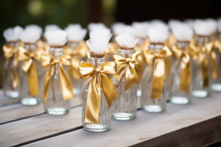 personalized mini champagne bottles with gold ribbon, created with generative ai