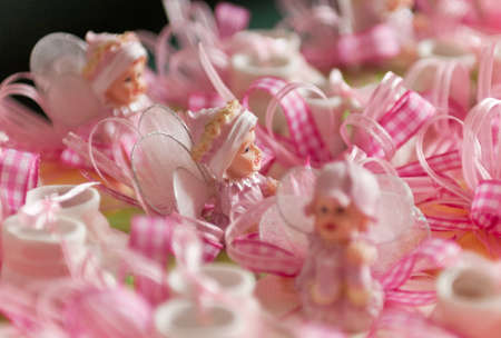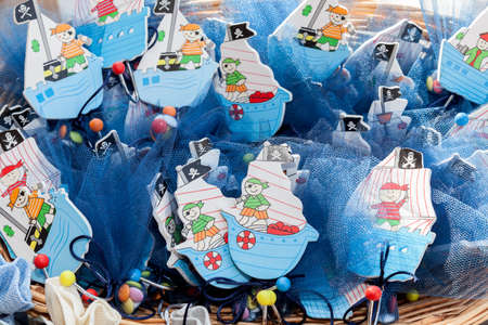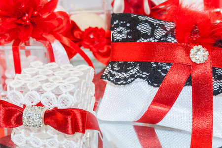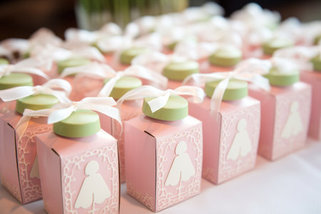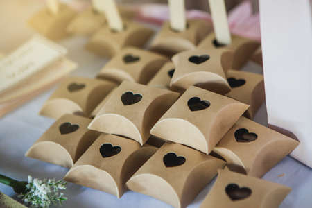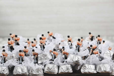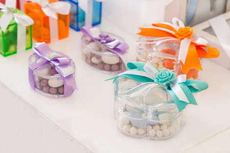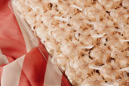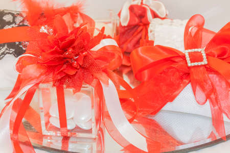 Close-up of wedding favors on a table, tied with ribbons, leaving room for copy space