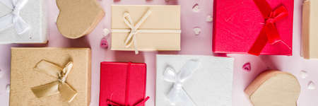 Valentines day gifts boxes background, frame for holiday greeting card background, with confetti candy hearts, flat lay, top view, copy space