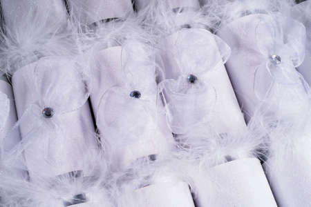 A studio shot of a set of Christmas Crackers or otherwise known as Bon Bons. A cracker consists of a cardboard tube wrapped in a decorated twist of paper with a gift in the central chamber.