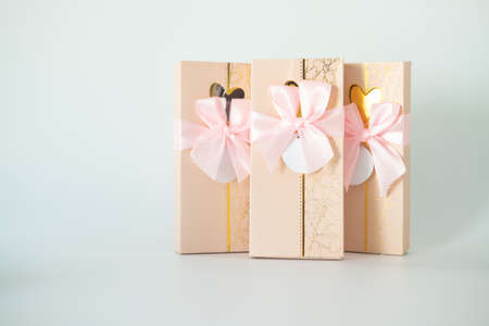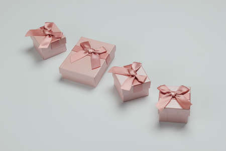 Gift boxes with bows on white background. Composition for christmas, birthday or wedding.