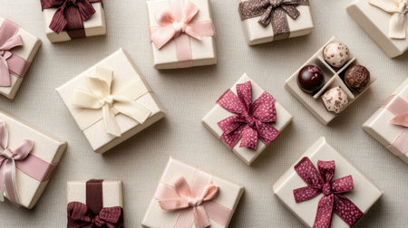 A delightful arrangement of assorted gift boxes adorned with elegant ribbons, featuring chocolates, perfect for celebrations, special occasions, or heartfelt gifting.