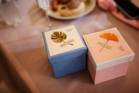 Gift boxes with bow on blue-pink pastel background. Composition for christmas, birthday or wedding.