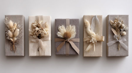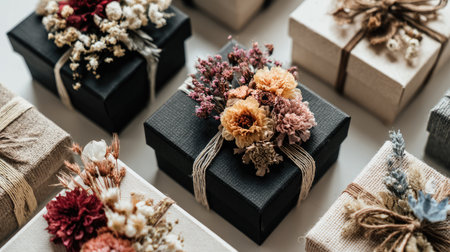 Discover a charming arrangement of elegant gift boxes adorned with dried flowers, showcasing rustic accents perfect for various celebrations and occasions.